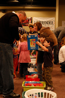 The kids lined up and got to go from basket to basket, with the help of their parents, and fill the stockings to the top.